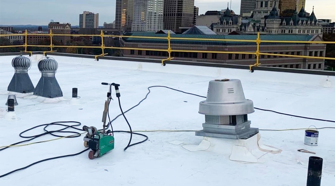 Hartford Restoration Services specialize in commercial and industrial roofing systems and solutions that offer a variety of benefits, including cost efficiency, temperature regulation, and the facilitation of rooftop utilities like ventilation systems or elevator machinery. Our experienced team is well-trained in built-up, modified bitumen, or single-ply roofing, such as TPO or EPDM, and excels in both flat roof installations and remediations.